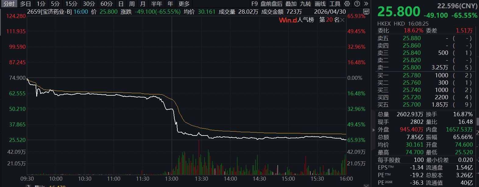 4月最后一个交易日,港股宝济药业-B(HK02659)午后突发闪崩。截至收盘配资炒股配资网站,宝济药业报25.80港元,跌幅65.55%。
