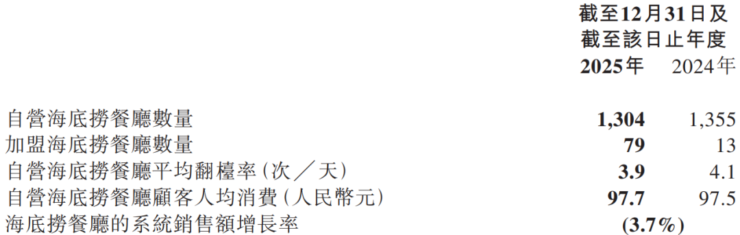 数据显示,海底捞几年来一直处于停滞之中。2022年末门店总数为1371家,2025年末也只有1383家。营收方面,2023年只比2021年高了0.8%,2024年稍回升至同比增长3.1%,紧接着便是2025年的1.1%。