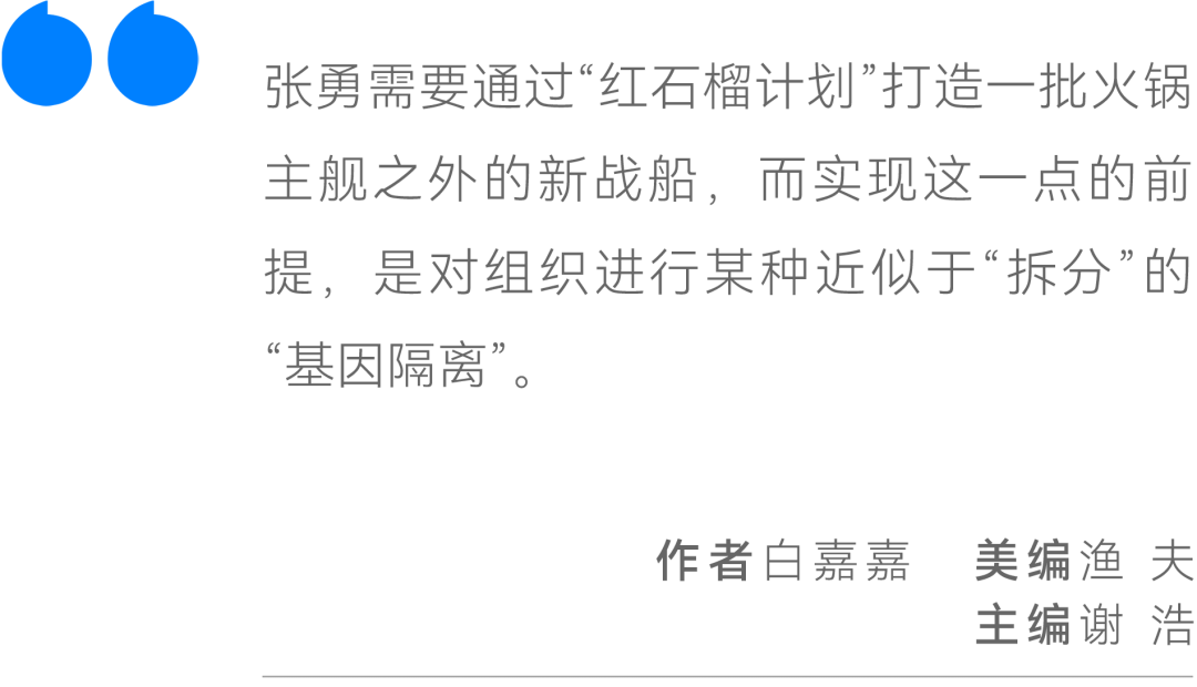 打破这层困局,才是张勇回归的核心任务。他需要通过“红石榴计划”打造一批火锅主舰之外的新战船,而实现这一点的前提,是对组织进行某种近似于“拆分”的“基因隔离”。