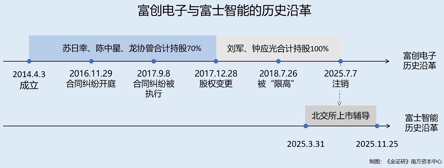 综上而言,富创电子注销前的地址与富士智能承租的一处厂房地址重叠。龙协、苏日幸、陈中星曾合计持有富创电子的70%股权,前述三人或在富创电子被限高前从富创电子退股。2025年,富创电子的注销备案/公告显示,龙协系富创电子的债权申报联系人。此外,富创电子系在富士智能签订辅导协议数月后注销。