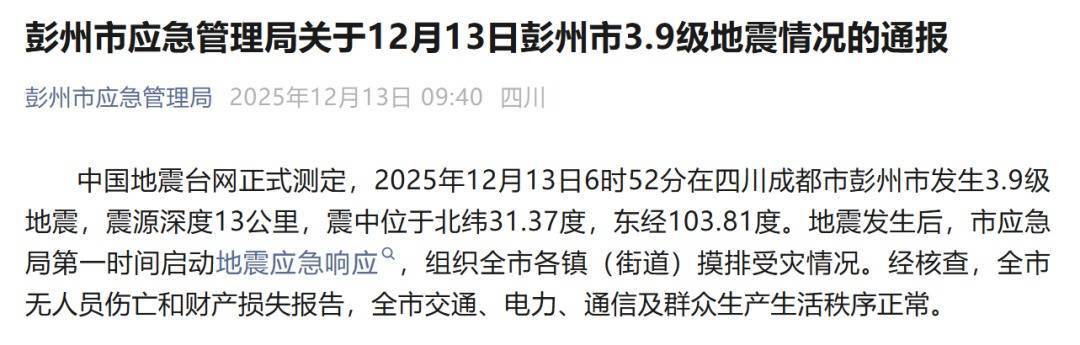 据彭州市应急管理局通报:中国地震台网正式测定开户配资网站,2025年12月13日6时52分在四川成都市彭州市发生3.9级地震,震源深度13公里,震中位于北纬31.37度,东经103.81度。